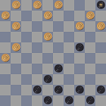 14. 42-37 16-21 15. 47-41 13-18 16. 10-5 18-23 17. 5×28 21-27 18. 32×21 11-17 19. 28×11 7×27 20. 43-38 12-17 21. 33-28 6-11 22. 48-43 9-13 23. 39-33 1-6 24. 34-29 3-9 zwart gooit met 03-09 een balletje op (zie diagram 2) 25. 37-32 46×37 26. 32×14 37x19x30x48 27. 29-24? Natuurlijk een knudde zet – om meerdere redenen gewonnen en zelfs door 25-30 28. 24×35 13-19 29. 14×23 48-43 * In dit geval is er behoorlijk wat “Kingsrow meditatie tijd” voor nodig maar zwart wint!