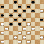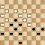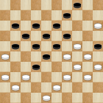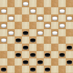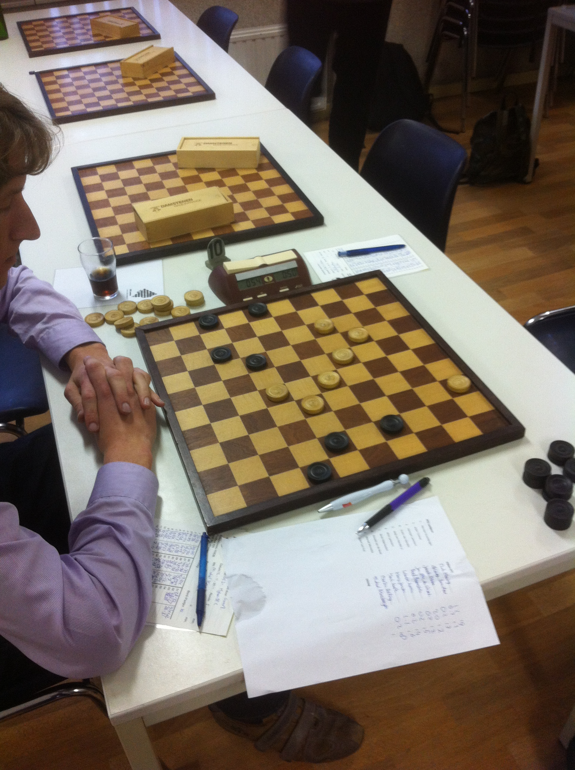 45. … 13-19 46. 33-29 8-13 (21-26 is natuurlijk nog steeds verhinderd) 47. 38-33?! 21-26? Mijn tegenstander bezwijkt dan toch nog. Een beetje naïef is het wel, want als ik geen actie zou hebben zou zwart natuurlijk op slag winnen.