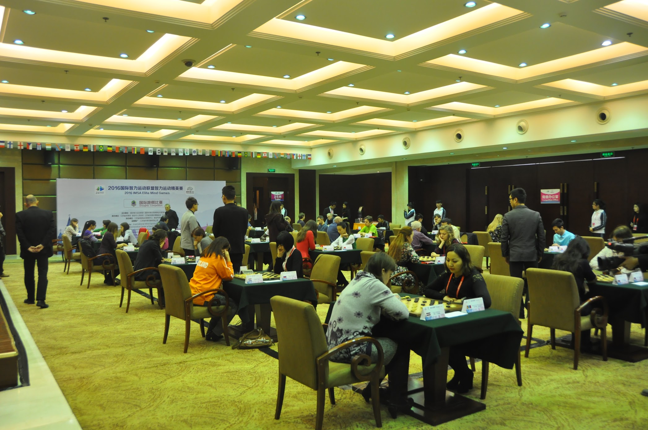 Waren er dan geen minpuntjes? Wel als je het vergelijkt met de vorige editie in Peking; daar werden de wedstrijden ook uitgezonden via YouTube, met live commentaar. Nu waren er wel 19 e-boards, maar ik heb niet het idee dat de wedstrijden veel gevolgd zijn (althans in Nederland); met de uitzendingen op YouTube was het in ieder geval zeer de moeite waard om het later nog eens terug te kijken. Ook jammer was dat de dammers verwijderd waren van de andere sporten; de schakers, goërs, bridgers en xiangquisten sliepen en spelen in een ander groot hotel op ongeveer 20 minuten rijden van ons hotel, wat het praktisch onmogelijk maakte om de andere sporters aan het werk te zien. Juist dat was ook een van de charmes van de WMSG in Peking, hoorde ik uit ervaringen van andere spelers. De reden van de organisatie dat er voor dammen geen plek meer was in het andere hotel kon worden weerlegd, er was simpelweg wel plek in het andere hotel; laten we hopen dat er achter deze ‘miscommunicatie’ geen diepere betekenis verscholen ligt. In Huai’an heeft de IMSA een contract getekend om de komende drie jaar de Elite Mind Games in de provincie Jiangsu te laten plaatsvinden; hopelijk zijn dan alle sporten weer gezamenlijk.